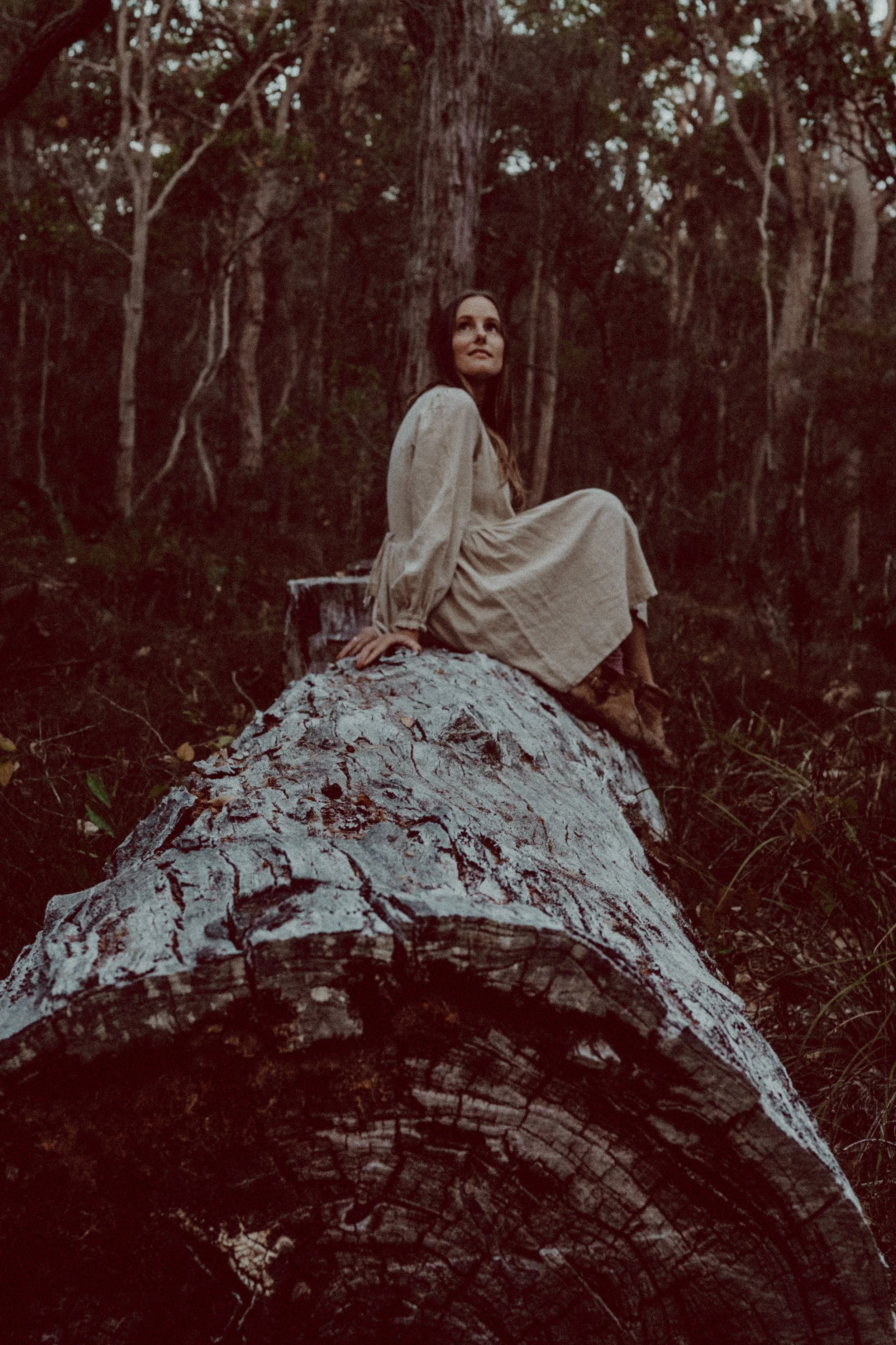 A woman sitting on a fallen tree trunk in a forest, with trees and foliage in the background.